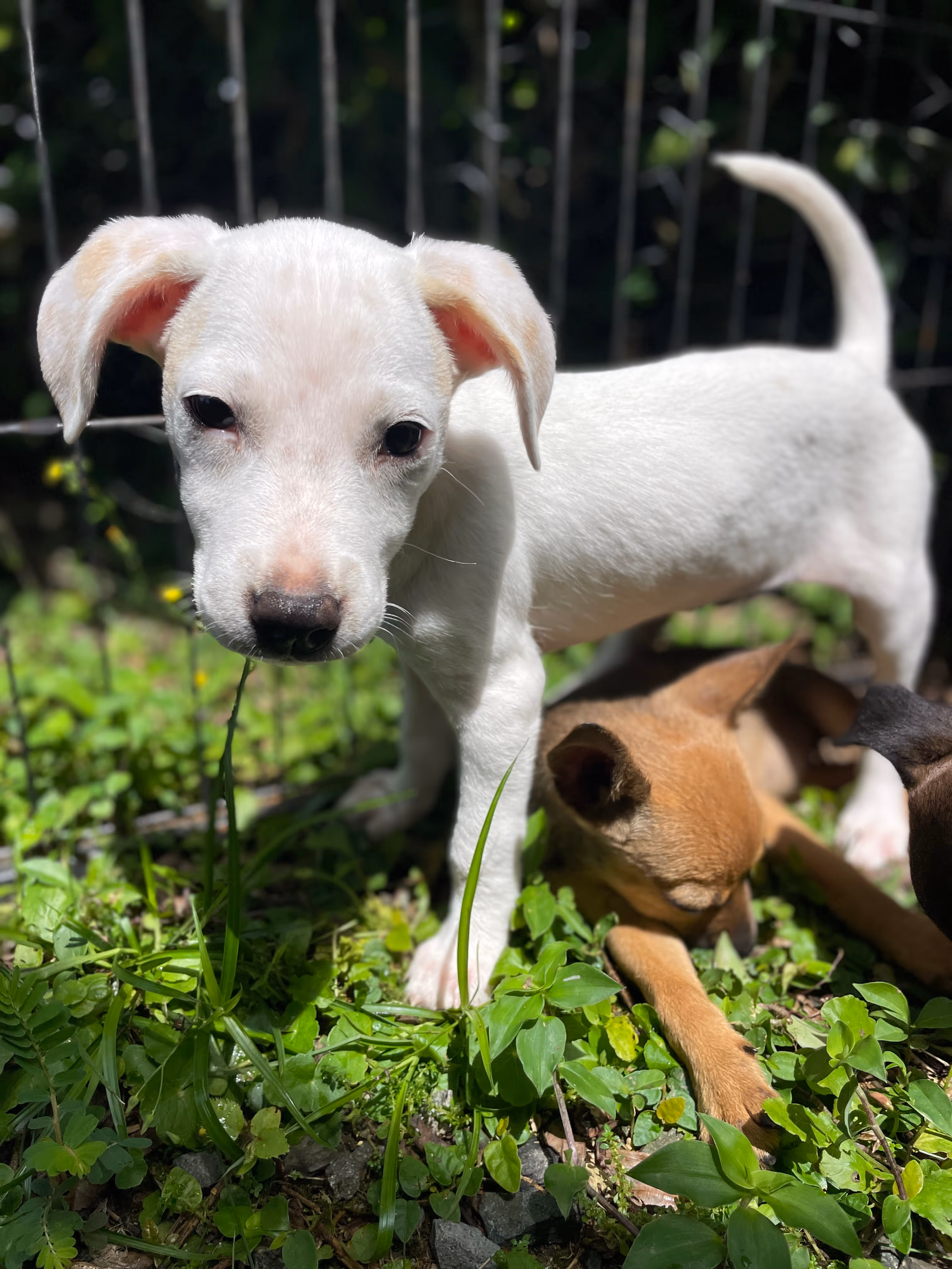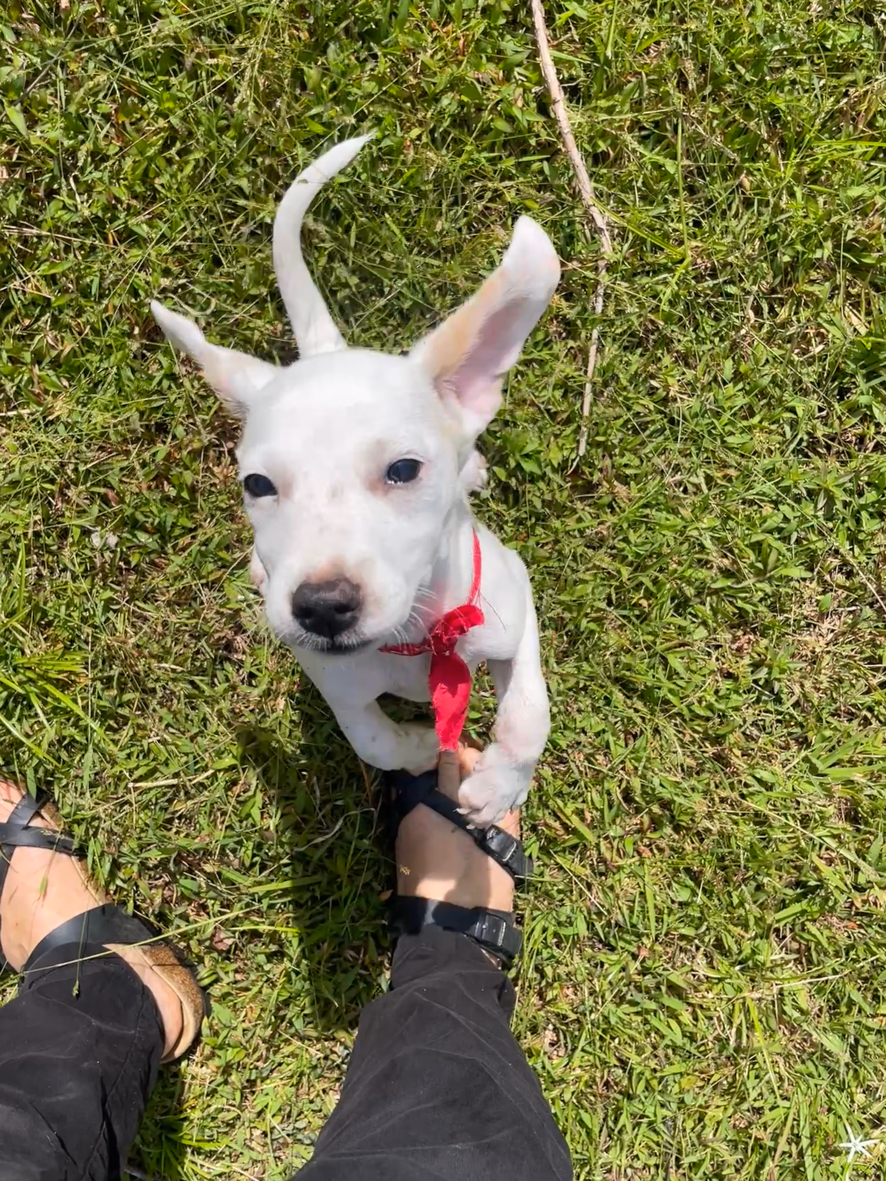 Bunny weighs just over 3 kg (6.8 lbs) at 10 weeks and is expected to reach about 8–10 kg (17–22 lbs) as an adult — a perfect small-to-medium size companion. With her white coat, floppy ears, and sunny personality, we think she might be a beagle mix or possibly have some Jack Russell in her.