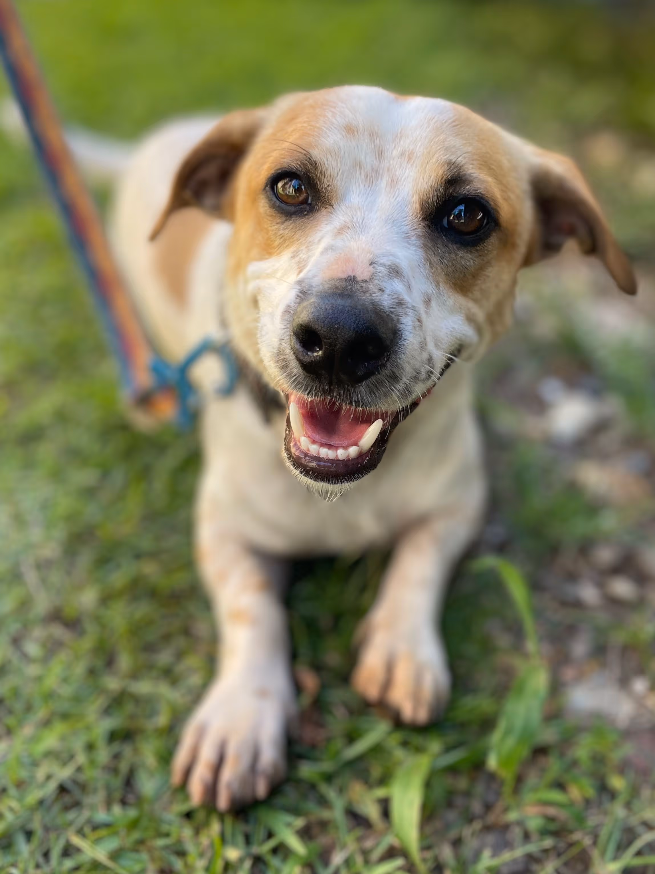 His foster home has a fenced property, so he doesn’t get taken on leash walks at the moment. He’s totally happy living that way, but with a bit of patience, we’re sure he’ll learn how to enjoy walks by your side if that fits your lifestyle better.