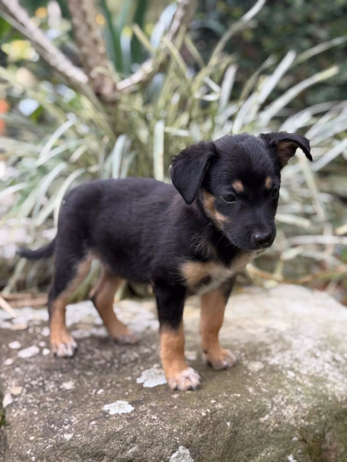 This beautiful pup is healthy, growing fast, and has a glossy black-and-tan coat that shines in the sun. The white tip of her tail wags like a little shooting star when she gets excited. She truly is such a treasure – sweet, curious, playful, and full of love.