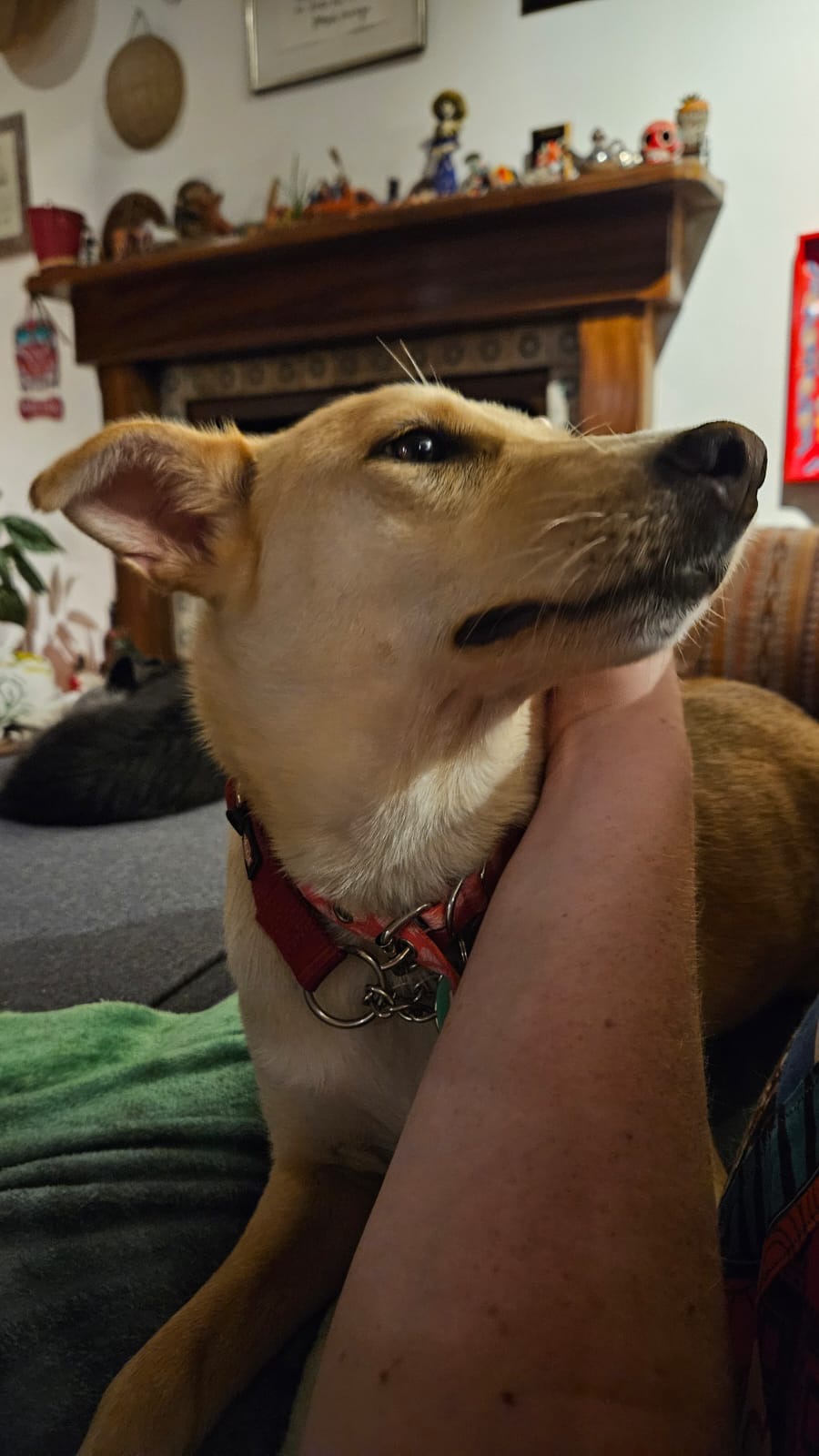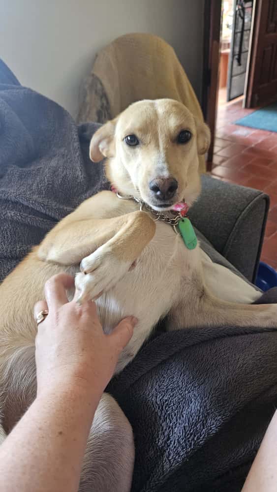 Savanna is about one year old, playful with other dogs, VERY affectionate, and loves lying close to you for belly rubs. She walks beautifully on a leash, is easy to train (very food motivated!), and is house trained.