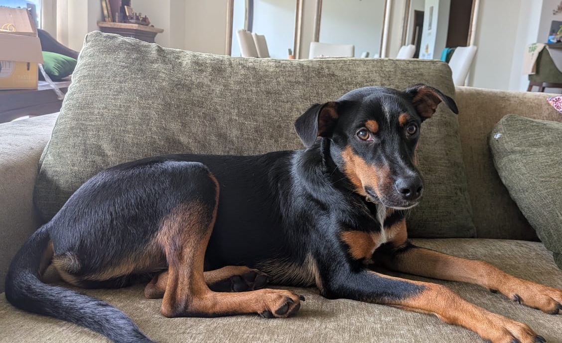 This sweet young lad is a total social butterfly and loves making friends—especially four-legged ones! In his current foster home, Simon gets along with dogs of all sizes, from large shepherds to tiny sausages. He plays gently, sweetly, and always with a wagging tail. We really hope his forever home has other doggy pals for him to enjoy!